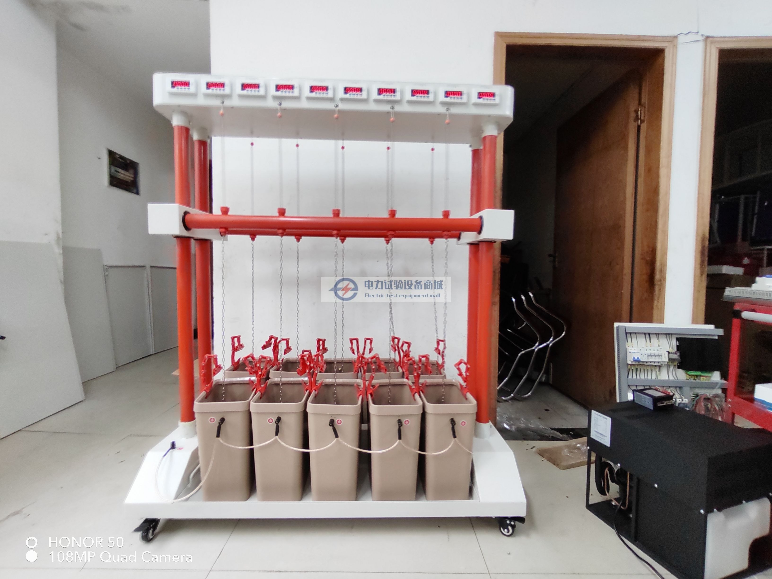 准备水电阻:使用前先将水电阻内注水(出厂时水电阻是空的,注水时不要注得太满,淹没电极即可),然后将注满水的水电阻安装在移动托架上,再将电极杆支撑两端插入绝缘撑杆和水电阻内。