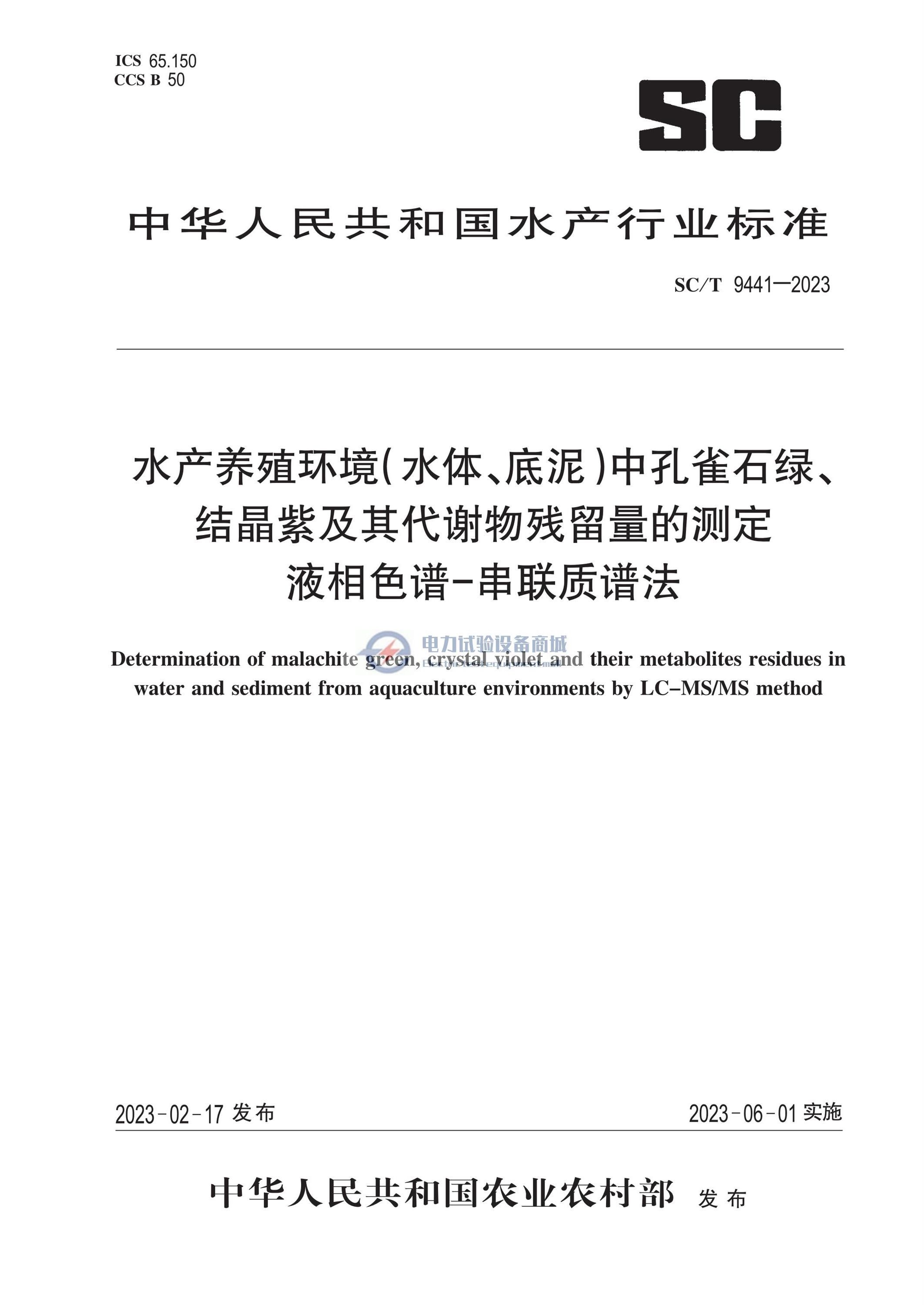 SC T 9441-2023 水产养殖环境(水体、底泥)中孔雀石绿、结晶紫及其代谢物残留量的测定 液相色谱-串联质谱法